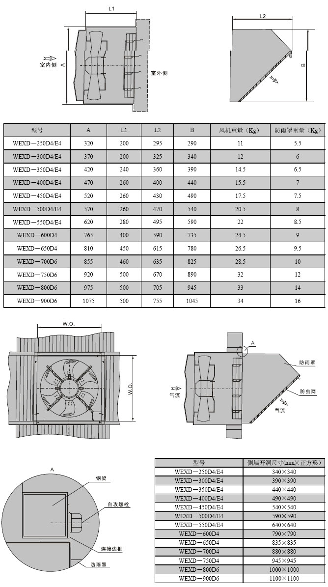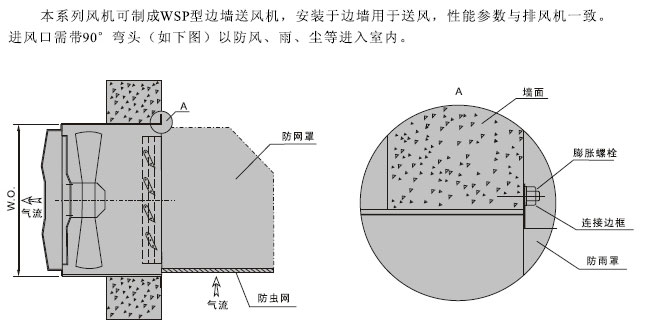 WEXD(WEX)系列風機一般用于邊墻壁式排風,配設45°防雨罩(或特殊制造成60°)和防蟲網(夜間可防止昆蟲循燈光飛入車間)。可按需要制成邊墻送風機型號為DWSP(WSP),配設90°防雨罩(防風、雨、塵)和防蟲網(夜間可防止昆蟲循燈光飛入車間)。附件選配:重力式止回風閥(可確保車間在風機不開時保持與室外隔絕),訂貨時注明。